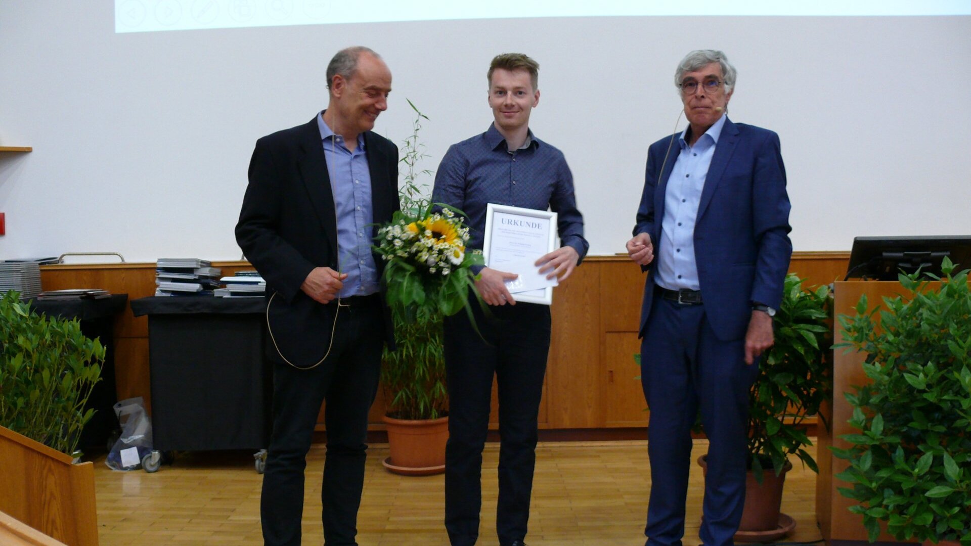Verleihung des Promotionspreises Dr.-Ing, Siegfried Werth Stiftung Gießen an Dr. Wilhelm Eschen (mitte) durch den Dekan Prof. Dr. Ulf Peschel (links) und Dr.-Ing. Bernd-Jochen Schniewind (rechts).