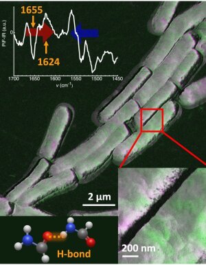 Die photoinduzierte Rasterkraftmikroskopie im mittleren Infrarotbereich (PiF-IR) ermöglicht eine nanochemische Bildgebung einer Bakterienoberfläche.