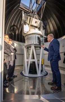 Prof. Tünnermann mit seinen Gästen in der Teleskopkuppel des neuen Forschungsgebäudes.