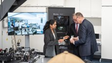 Doktorandin M. Monika erklärt Quantentechnologie dem Staatsbesuch.